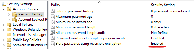 Now, back to the creation. The next thing we had to do is enable a setting called “Reversible password encryption.” We set this through an application called group policy editor. This enabled us to, well, encrypt passwords in reverse, or, decrypt passwords! Without this setting, the exploit would be completely impossible.
